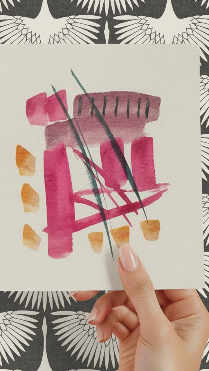 Painted by hand on textured archival watercolor paper, this small abstract artwork explores the balance between bold color fields and delicate linework. The playful yet modern palette makes it perfect for brightening contemporary interiors, gallery walls, desks, and styled shelves.